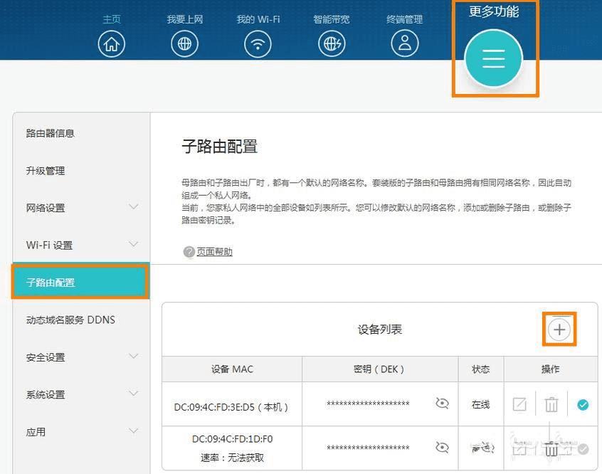 登录路由器 Web 配置界面“192.168.3.1”,选择“更多功能 > 子路由配置",点击添加按钮,输入子路由铭牌上的 MAC 地址和 DEK 码即可,注意添加时,子路由必须接通电源(此方法适用于所有的子路由配对)。