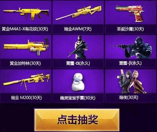 M4A1-SS-茉莉(30天)、子锤子(30天)、黄金手雷(30天)、CFVIP(30天)、2000战队贡献值。