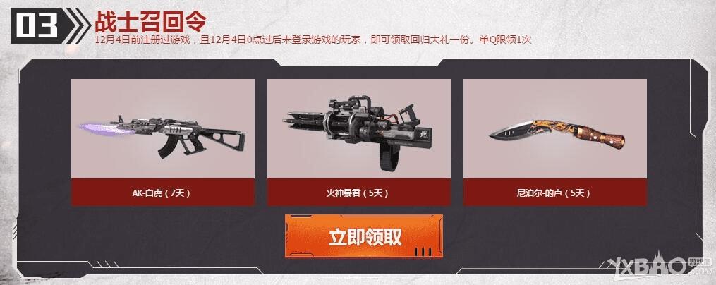 12月4日前注册过游戏,且12月4日0点过后未登录游戏的玩家,即可领取回归大礼一份。单Q限领1次