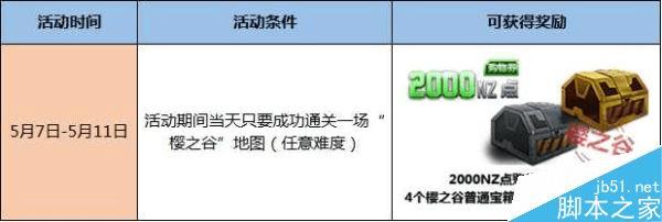 活动期间(5月7日-5月11日)当天只要成功通关一场“樱之谷”地图(任意难度)即可获得庆典福利礼包,内含:2000NZ点购物券(7天)一张/4个樱之谷普通宝箱/2个雷藏专属武器箱(宝箱为樱之谷成功通关的掉落宝箱,一定几率可开出新图专属永久武器)。完成通关任务后,奖励将自动发放至个人仓库,但每个Q号仅限获得一次。