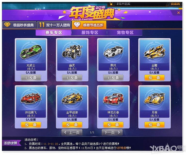 首次开启票选打折道具活动!玩家可以根据自己的喜好,在赛车专区、服饰专区、宠物专区通过您神圣的一票,选出您心怡的道具,对于票选前三的道具我们将在感恩节当天在商城进行五折特卖哦!