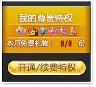 在界面右侧,您可以看到您已经开通的特权和享受的免费礼物份数,如果全部开通可以享受8份礼物哦!玩家可以点击特权按钮来快捷开通和续费哦!