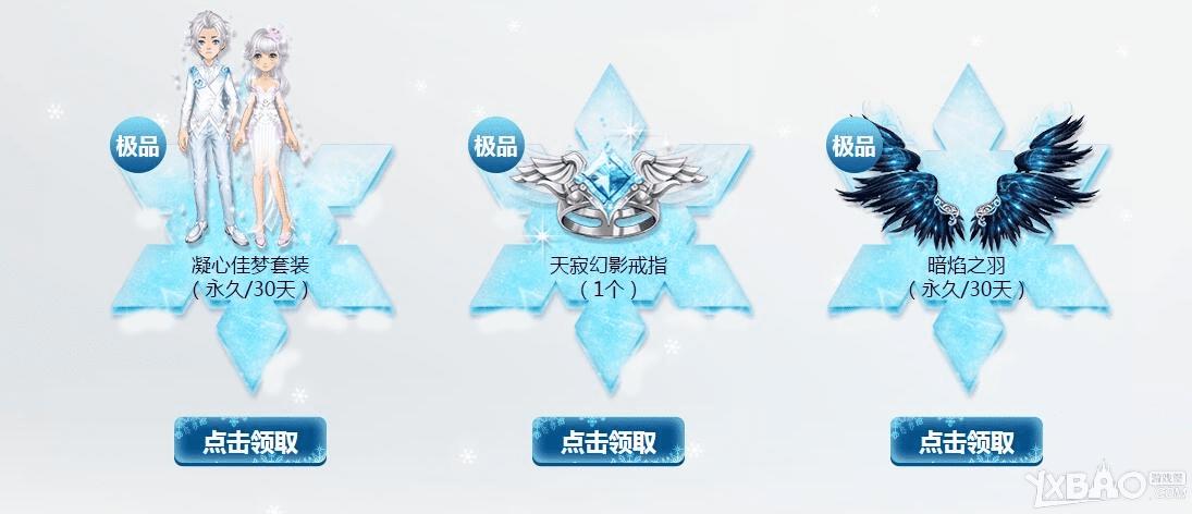 3.凝心佳梦套装(永久或30天)、天寂幻影戒指(1个)、暗焰之羽(永久或30天)
