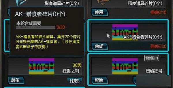 小编在仓库中发现AK-猎食者碎片道具,目测武器的获取方式是不断刷新图搜集碎片,集齐20个有几率获得永久。
