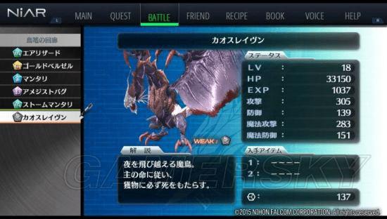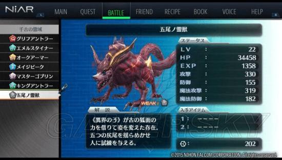 | 战斗笔记 | グリフアントラー、エメルスタイナー、オークアーマー、メイジビーク、マスターゴブリン、キングアントラー(S グリード)、五尾ノ霊獣(BOSS) |