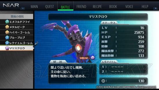 | 战斗笔记 | エメラルドフライ、メタルビーク、ハイパーゴーレム、ブルーブロブ、レクイエムゴーレム(S グリード)、マリスクロウ(BOSS) |