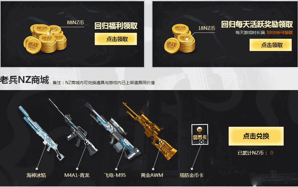 活动期间内, 3月2日后,未登录过游戏的逆战老玩家,可领取回归专属NZ币,每天完成活跃任务还能继续领取NZ币。累计NZ币可任意挑选兑换老兵NZ商城内武器或道具,但活动期间,每种道具武器仅限兑换一次。NZ币仅限本活动页面使用,无法领取至游戏内。