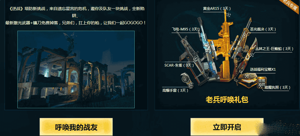 今天小编给大家带来的是关于逆战 2016老兵回归有礼活动网址及活动内容介绍,小伙伴们一起来看一看吧。逆战老兵回归有礼活动更新,为召唤老兵!小编为大家带来了逆战2016老兵回归有礼活动!活动中将为老玩家送出NZ币,专属礼包等奖励