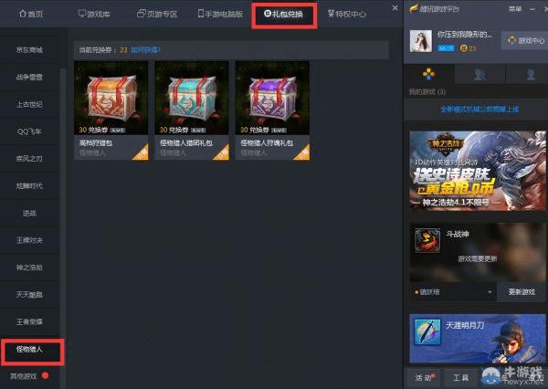 3. 点击上面的“礼包兑换”,接着在左边选“怪物猎人”,然后就可以选择奖励兑换了。