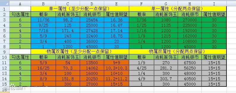 最后结论上来看,需要满属性的壕友们还是勾选单一属性比较合算,虽然勾选5和6消耗首饰玉稍少,但这种需要看肤色的事情至少我等非酋是不敢参与的,银币消耗差距也不大(壕友的毫毛不不值。)
