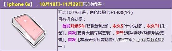 在飞车商城购买iPhone6s,开启不仅可以100%获得角色经验卡+1400,还有机会获得:首发升级S【终极暴风雪】、永久S【十字先锋】、永久T1【朱雀】、首发极品【霹雳天使专属套装】、变身极品【绯烟娆梦/晓楼烟尘套装】、首发极品【霹雳天使专属翅膀/手杖/戒指】或其他奖励之一!千万不要错过哦!