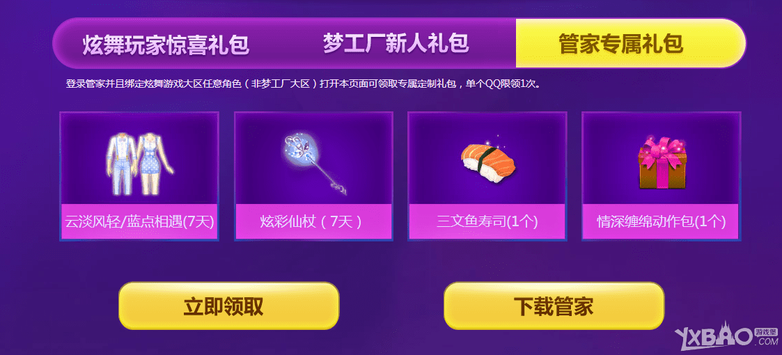 4、登录管家并且绑定炫舞游戏大区任意角色(非梦工厂大区) 打开本页面可领取专属定制礼包,单个QQ限领1次。