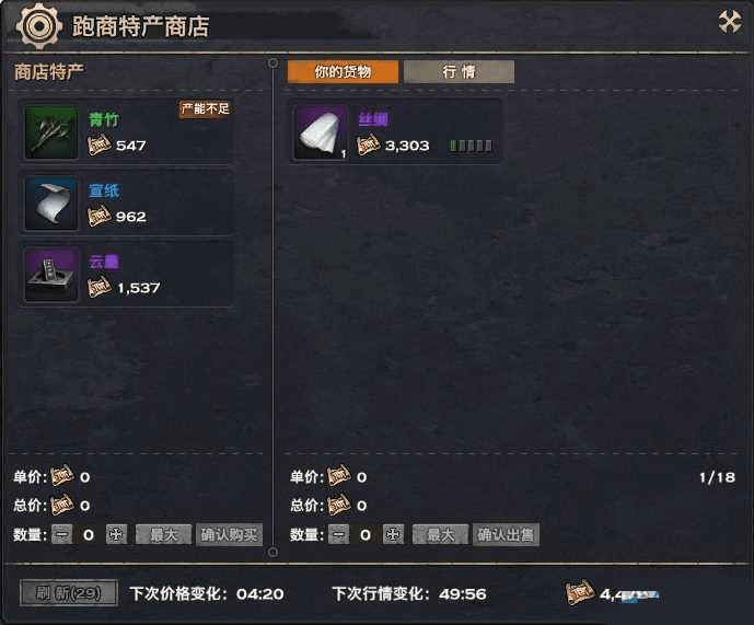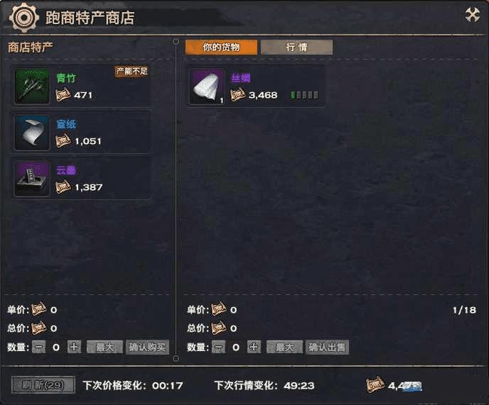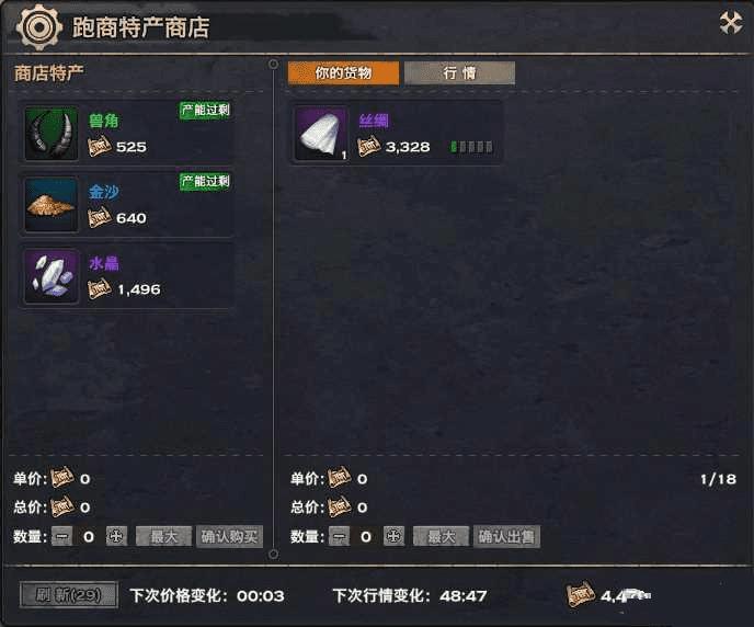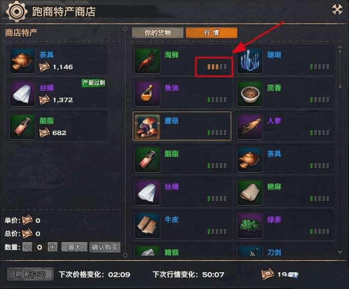点击特产商店行情,你就可以看到所有特产在本商店的收购行情。右下角像能量点数的标识其实是该特产在本地的存货量,当本地收购了一定数量的特产时,存货量就会发生变化,接着收购价格就会发生变化。存货量显示为绿色时,表示存货不足,收购价格就会上涨;存货量显示为红色时,表示存货过多,收购价格就会下跌。