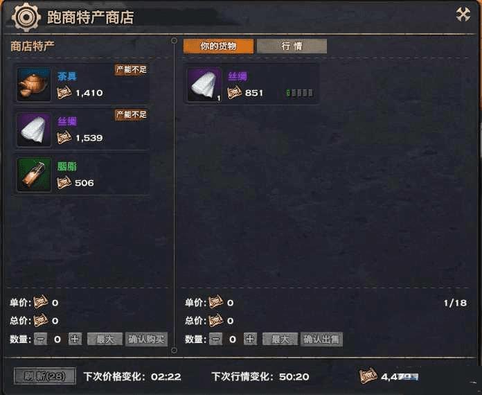然后再跑到帝都南部和不归荒漠,发现收购价格是3293商票和3328商票,基本没有变动。所以丝绸的价格在神语书院处已经达到了最高,想取得最大收益的话,丝绸只需要贩卖到神语书院。