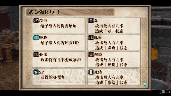 而在武器成长方面,玩家不但可以购买武器防具,同时还能为心爱的武器防具来进行强化。武器强化包括选项包括攻击,吸收,必杀,SP,毒,麻痹,燃烧,冻结八个方面,可谓丰富。强化成长让玩家会更在意自己战斗的收集品,期待每一次战斗。