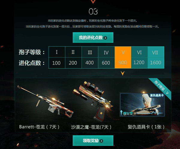 当玩家的进化点数达到指定值时,玩家的生化孢子将会进化到下一个层次。当玩家的生化孢子进化到某一层次后,玩家即可领取该层次的对应奖励。每层的奖励在活动期间仅限领取一次。