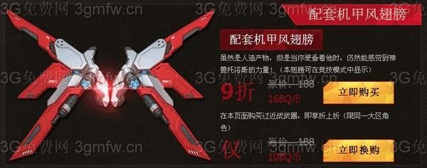 4全新机甲风饰品-托洛斯之翼原价为188Q币,活动期间内优惠价168Q币;若在本页面购买过近战武器(限同一大区角色),在页面内翅膀享受折上折特惠价108Q币。
