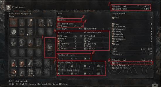 下方一行为武器的能力需求,从左到右分别为【力量】、【敏捷】、【智力】、【信仰】,每把武器都有有自己的一套能力需求