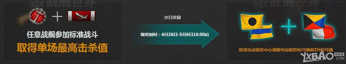 每天使用任意战舰在活动时间内参加标准战斗,取单场最高击杀值,可于次日登录活动领奖中心领取对应的ID(+20%使用维修小组消耗品时恢复的血量)和ZH(增加50%舰长经验)信号旗奖励。每天仅可完成1次。完成相应数量的击杀还可获得商城优惠券的奖励。
