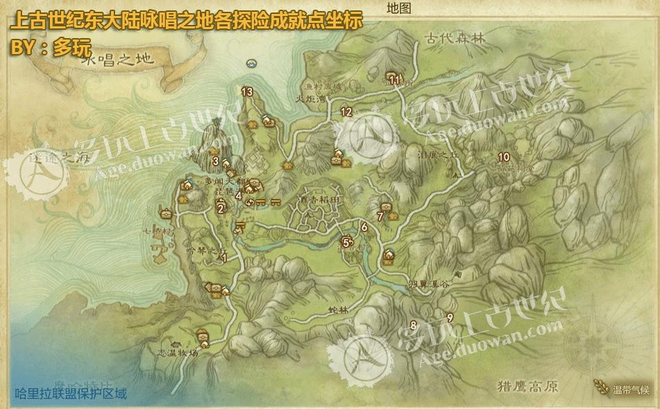上古世纪东大陆咏唱之地有13个探索点,13个探索点根据下图顺序已分别在下图标记出,具体的每个探索点图上有专门解说: