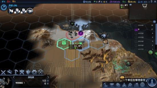 探险家按M键进入移动模式,先去上面捡资源舱,因为再上面肯定是成片冰原的北极,不需要怎么探,所以先把这个资源舱捡了,然后这个初始的探险家打算从上方往左边走去探一下首都左边的那条河附近的情况,看看是不是个良好的分城选址,顺便可以捡了左边那个资源舱,首都国际惯例锤探险家,工人就地开发甲壳质这个地块,3粮1锤1能量是初期非常高产的地块了。科研的话可以看到我选了先开创后工程学,为的就是尽快探明钛资源的分布。。