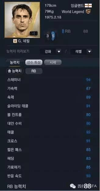 韩服的元老传奇加里·内维尔,可以看到国服的速度、加速、体力和抢断这四项关键能力值都被大砍了一刀,此卡韩服目前售价为2亿。