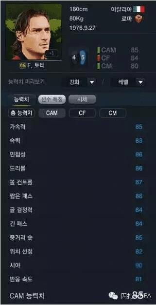 罗马的06W托蒂,我们可以看到除了远射与视野两项外,托蒂的能力值几乎与斯科尔斯不相上下,甚至速度还高了不少,06W托蒂目前在韩服的价格为700W。