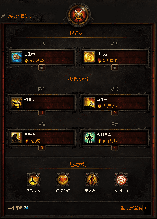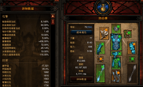楼主PTR之前一直在玩圣教军,二号补丁更新后用武僧冲了下天梯,全身只有4件远古,宝石最高的是37级的困者,远古罗盘还是从法师身上卸下来的,试了下65,10分钟过了,冲70撕了几张地道,银光塔冲了一半出了3007就放弃了。我目前用的是火鞋黄道破碎流,操作起来异常无脑,上好buff疯狂刷黄道解放,破碎利用效率很高,基本上面板有60%以上时间在100%爆率状态,小弟锤起来也拳拳烈火。BD还不成熟,大家多多包涵哈