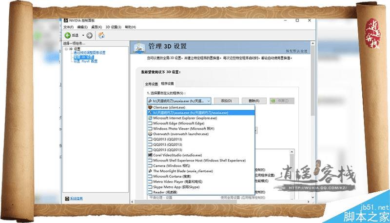 3、打开“3D设置”选项,在第二个“管理3D设置”的“全局设置-首选图形处理器”下拉菜单中选择“高性能NVIDIA处理器”;在“程序设置”选项卡中的“选择要自定义的程序”里添加天涯明月刀游戏,此处显示的可能是“wuxia.exe”或者“wuxia_client.exe”,若是不知道该选择添加哪一个就都添加上,然后在“为此程序选择首选图形处理器”中选择“使用全局设置(高性能NVIDIA处理器)”;
