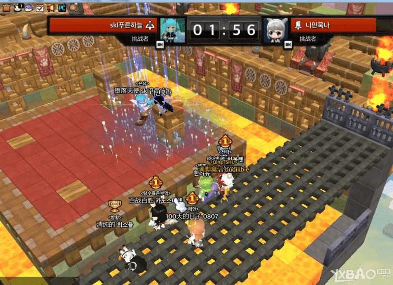 轮流上台进行1V1战斗,每次胜利的玩家在下一场都会回满血。最后留在台上的玩家获得胜利。