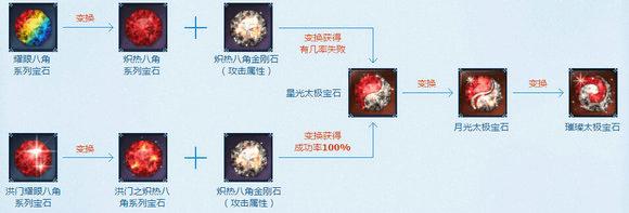 通过上图的方法或者公式:炽热/洪门炽热八角黄玉+炽热八角金刚石(攻击属性)→星光·太极黄金石来获得。