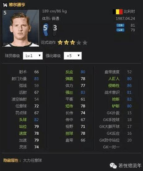 14维尔通亨的银卡,比利时铁卫,受益于上次数据更新,从一个廉价的妖人一下子成了国服炙手可热的热门球员,一个完美的后场万金油(也可很好受任后腰边后卫的球员),银卡出色的双速,不错的模型,良好的传控能力,优秀的防守属性,更重要的是他是一个左脚的超级多面手哦,可以很好的与琳琅满目的右脚球员形成互补,为数不多的缺点是平衡略差。