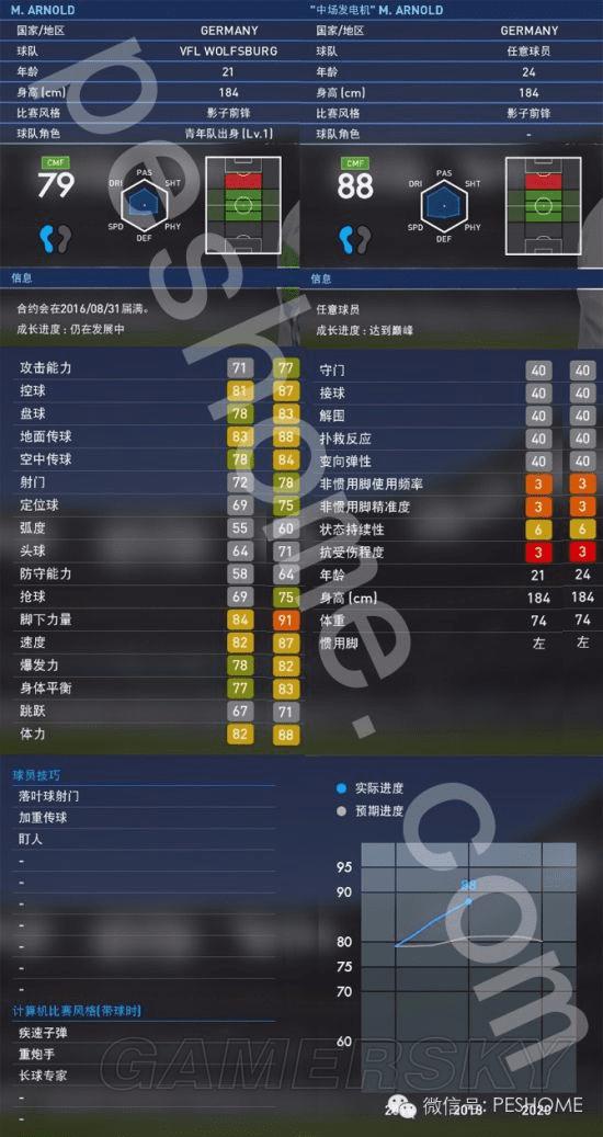 使用评价:阿诺德在游戏里完全是德国的又一闪闪发光的新星。强大的中场支配能力,让他在比赛中总是以核心的角色存在,优秀的盘带控球能力,在中场可谓如鱼得水。但是和皮尔洛哈维等纯粹的组织型中场相比,阿诺德有更加活跃的跑动能力,特别是对门前的冲击力可谓死神级别的,与总是乱跑失位的莽夫不一样的是,只会在球队需要他的时候他才会出现在前场,球队无法打开局面的时候,他机灵的跑动总是能制造杀机,见血封喉。有时候在对方后场,他还会以非常诡异的角度冲出来把球拦截下来,直接策动前场的快速反击。小蓝很少见到过有速度比边前卫还要快的中前卫,阿诺德就是其中之一,充沛的体能甚至能让他做一个b2b的角色。当然最后还要说到他的远射功夫也是非常了得。吹了这么一大轮,最后总结,阿诺德是小蓝最近几代实况以来,用得最有存在感的一名球员,综合能力非常强,希望大家喜欢。