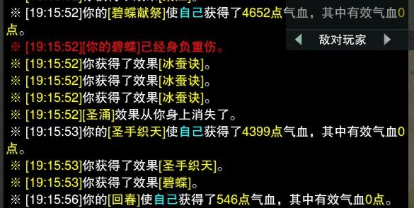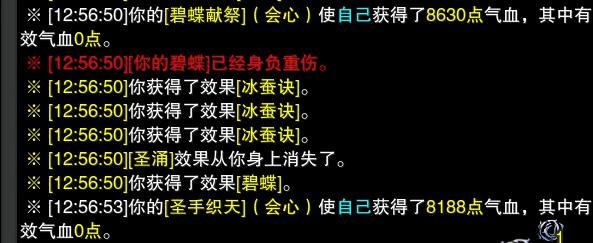 2、这个BUFF会有一个小小的延迟,目测按顺序读取和原来的驱散BUFF是同个时间段读染原驱散BUFF也是先加血后驱散】,如上图,可以看出碧蝶献祭后,先加血,再产生三瞬发BUFF,再产生碧蝶BUFF(必会心)。所以如果你手速特别特别特别快,容易造成你的瞬发没享受到这个BUFF(如下图,圣手在BUFF之前用出),但是这个BUFF不会消失,会作用于下一次治疗。