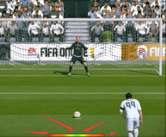 新引擎下,我们在罚点球的时候屏幕下方会多一个力度条,这个力度条跟我们小时候在红白机上面玩的台球游戏很像,在绿色的时候力度是最佳的。