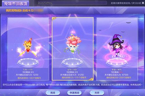 - 在宠物训练场中,玩家需要让自己的上阵宠物挑战宠物BOSS战队,挑战成功后可获得宠物币和其他物品奖励。不同的宠物BOSS战队难度不同,奖励也有所不同。