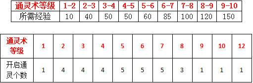 首先看一下通灵术等级升级所需经验和能开启的通灵兽个数