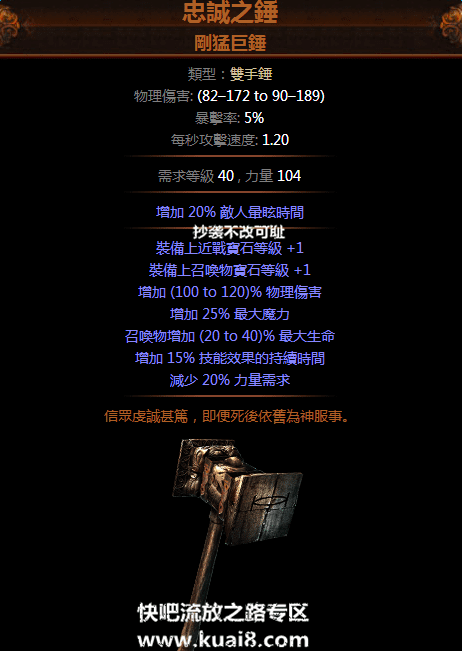 以上就是流放之路忠诚之锤属性详细介绍的全部内容了,希望对大家有所帮助。如果大家想了解更多游戏活动与游戏攻略,请持续关注本站,本站小编将在第一时间为大家带来最好看、最好玩、最新鲜的游戏资讯。更多精彩内容,尽在本站!