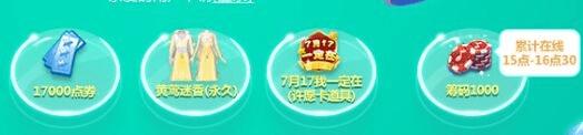 7月17日15点整点在线,即可轻松获得17000点券、永久套装、许愿卡道具,参与累计在线还可以获得1000筹码。