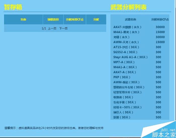 4、获得的道具存放在【暂存箱】中,可选择分解成CF点或发往游戏仓库;