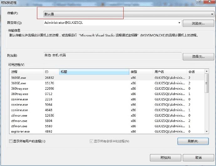 调试-附加到进程(注意传输选择:默认值,限定符输入远程机IP )