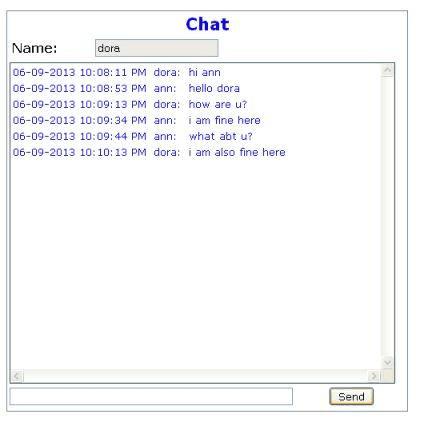 通过聊天窗口底部的输入框输入聊天文本。点击Send按钮,就开始执行函数set_chat_msg。这是一个基于Ajax的函数,因此无需刷新页面就可以将聊天文本发送到服务器。程序在服务器中执行chat_send_ajax.php以及用户名和聊天文本。