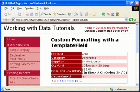 完成了ItemTemplate之后,产品信息就以一种更加不规则的方式来显示了。来比较一下上一节中的DetailsView的输出(图三)和本节所讨论的FormView的输出(图四)。
