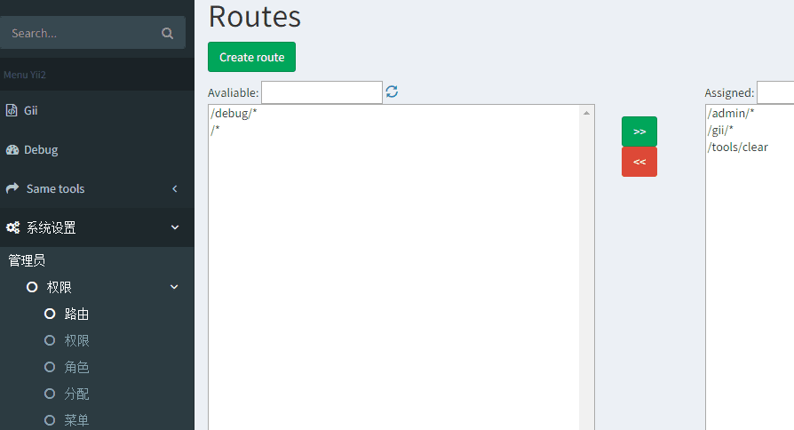 首选,我们访问/admin/menu/index添加几个一级菜单,姑且叫做一级1,一级2,一级3吧,哦对了,忘记添加路由了,怎么回事呢,我们先访问/admin/route/index 把左侧的路由移动到右侧,不然上面创建新菜单会失败哦。创建菜单时,[映射][数据]我们暂且不填写。