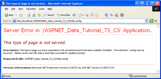 由于Web.config文件包含了敏感的信息,比如连接字符串.所以确保Web.config文件内容的安全性是很重要的,对未经授权的访问者应隐藏这些敏感信息.默认情况下,对.config后缀名的文件的任何HTTP请求都由ASP.NET引擎来处理,它将返回“This type of page is not served”的信息,如图1所示.这意味着访问者无法通过在其浏览器的地址栏键入‘http://www.YourServer.com/Web.config'来访问你的Web.config文件.
