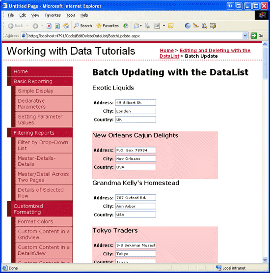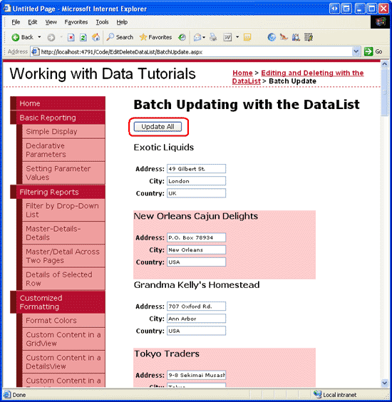 本章学习了如何创建一个完全可编辑的DataList。通过它用户可以快速的修改多个supplier的address信息。我们首先定义了编辑界面 — address,city和country都以TextBox来表示 — 在DataList的ItemTemplate里。然后我们在DataList的上下各添加了一个“Update All”button。用户修改完后,点击其中一个后,每个DataListItem都会调用SuppliersBLL类的UpdateSupplierAddress方法。