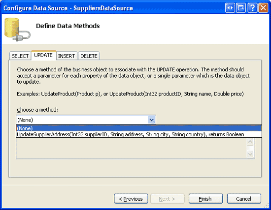 使用SuppliersBLL类的GetSuppliers()方法配置ObjectDataSource(见图3)。象前面一章那样,我们将直接使用 BLL而不是通过ObjectDataSource来更新supplier信息。在UPDATE标签里选择None(见图4)。