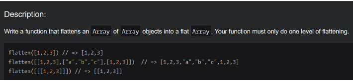 console.log([].concat(1,2,3)); //[1, 2, 3] console.log([].concat([1],[2],[3])); //[1, 2, 3] console.log([].concat([[1],[2],[3]])); //[[1], [2], [3]] console.log([].concat([[[1],[2],[3]]])); // [[[1], [2], [3]]]