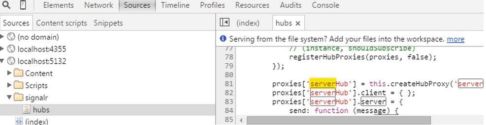 在第二部分介绍的时候说道,在服务端声明的所有Hub信息,都会生成JavaScript输出到客户端,为了验证这一点,可以在Chrome中F12来查看源码就明白了,具体如下图所示: