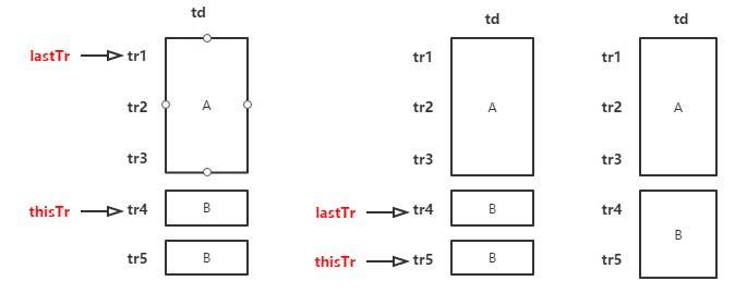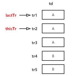 1) tr1与tr2比较,两者值相等:设置tr1的rowspan属性的值+1;设置第tr2的td隐藏。